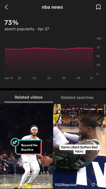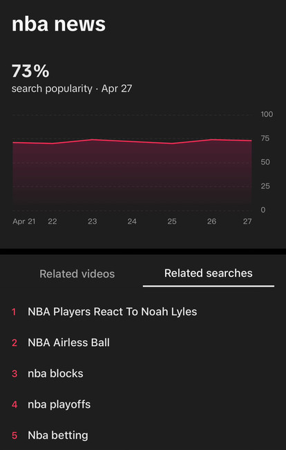 Another example is for content creators who discuss and follow the NBA. Creator Insights provides related topics and videos so you can see what similar creators are doing. This is an immensely valuable SEO platform to gives you topics to mention, hashtags, trends, and insights into what users are so you can create videos to broaden your reach beyond your typical niche on a specific topic, team, or player that you discuss.