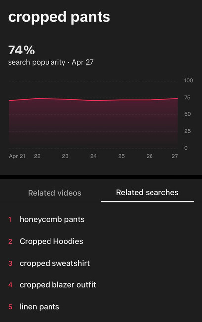 For example, if you're a fashion brand looking for potential influencers or clothing their customers are looking for, Creator Search Insights gives you trends your audience might be looking into as the weather gets nicer and people add to their wardrobe. Last month TikTok users were searching for cropped pants and Search Insights provides related videos and search topics that users who are looking for cropped pants are viewing. As a content creator, you can find topics that are searched for often but don't have many videos available, allowing you to create content on topics that have high search value but low competition.